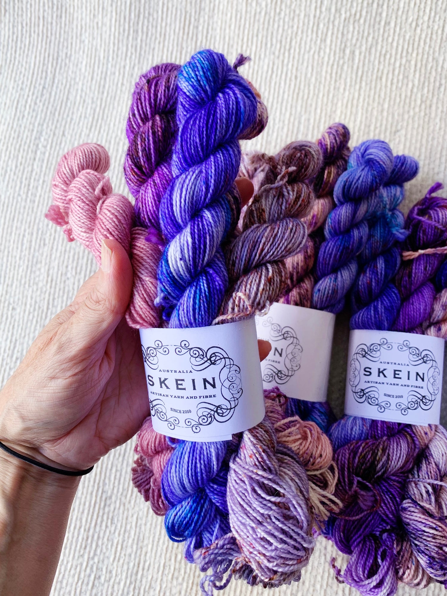 A set of five, 20g mini skeins dyed in a combination of purple hues.
