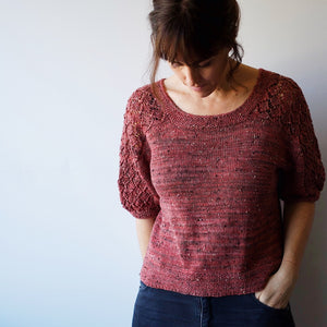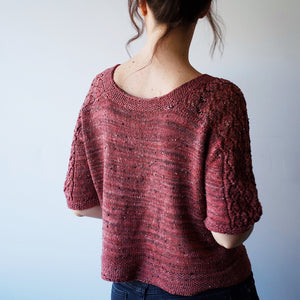The body length for this design is cropped; however, you can easily extend the length by adding extra rows before you begin the seed-stitch hem. The overall ease for the blouse is 4" (10cm) but if you would like to size down a little, be sure to review the schematic as the sleeves are more fitted at 1" (2.5 cm) of ease.