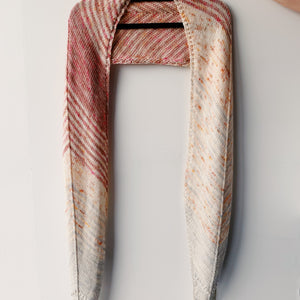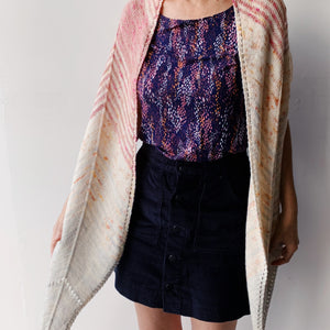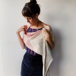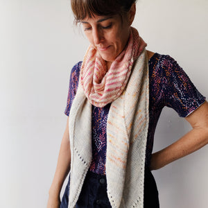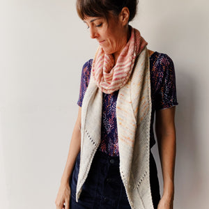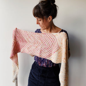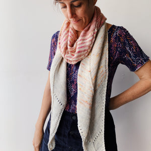 Limeni is knit from end to end, beginning and ending with tapering tips that feature a row of eyelets. The wrap also features stripes and colourblocks that run diagonally to a central spine.