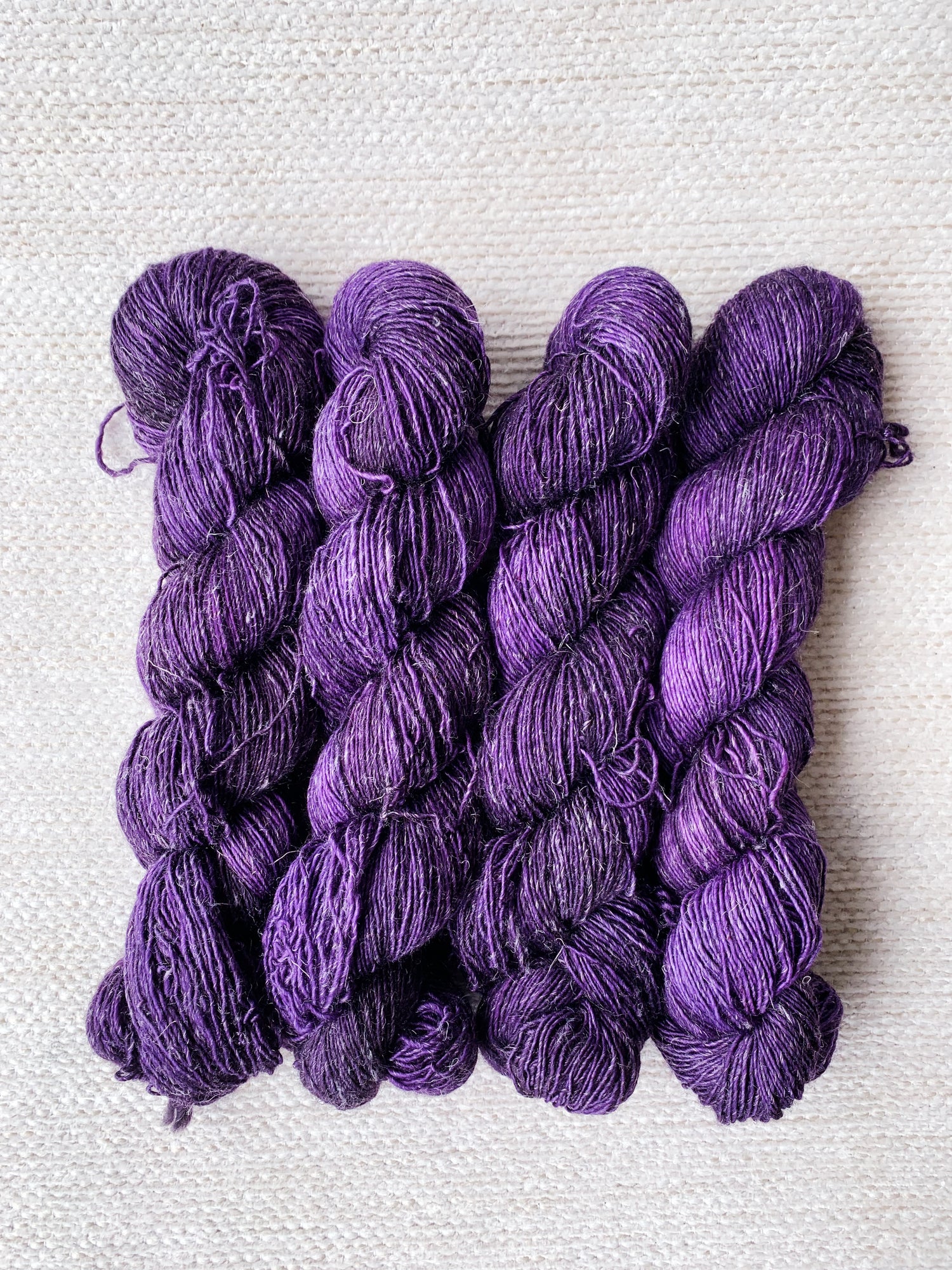 A soft and plump, single ply yarn which knits up into a light fabric with a lovely drape. The linen is a pale grey which does not take up dye. This creates a beautiful heathered look. The linen fiber also creates a halo effect which gives the yarn a rustic appearance, but rest assured these fibres are as soft as can be. Ideal for just about any project.