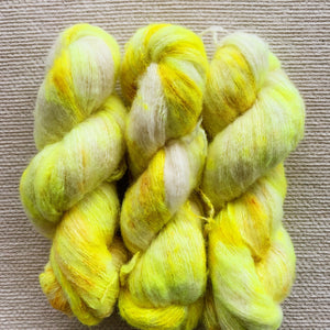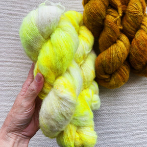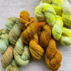 A delightfully soft and fluffy yarn that is spun with a core ply of cotton that remains white after dyeing. This produces little white flecks and adds further depth to each colourway. Ideal for shawls, garments and hats.