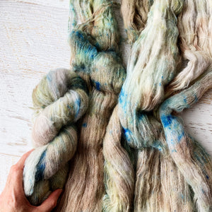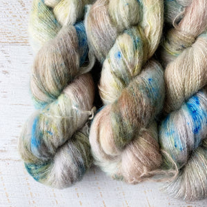 A delightfully soft and fluffy yarn that is spun with a core ply of cotton that remains white after dyeing. This produces little white flecks and adds further depth to each colourway. Ideal for shawls, garments and hats.