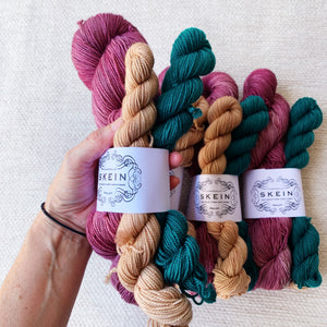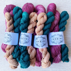 Colourwork Sock Sets contain a 100g skein with two contrasting 20g minis.  They are perfect for colourwork socks, cowls, mitts and more!