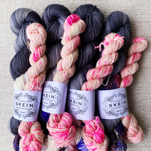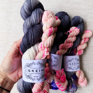 Our special edition sock kits are inspired by beautiful Halloween illustrations.  Colours will knit up into a micro striping pair of adult socks.  Each kit comes with a 20g mini skein dyed in a co-coordinating colour for fun heels and toes, stripes or colourwork.  Colourways are one-of-a-kind and will never be repeated, so if you see a kit you love, grab it while you can.