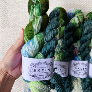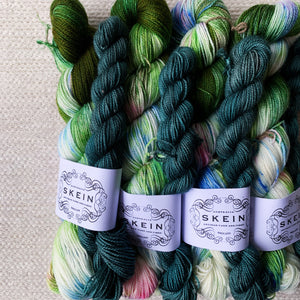 Inspired by floral folk art this sock set colourway is OOAK and will knit up into a pair of micro-striping socks. There is enough yardage in a sock set to easily make an adult pair of socks.