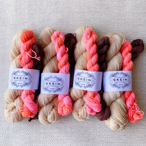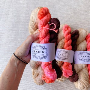 Colourwork Sock Sets contain a 100g skein with two contrasting 20g minis. They are perfect for colourwork socks, cowls, mitts and more!