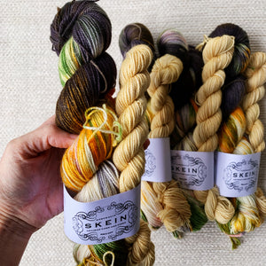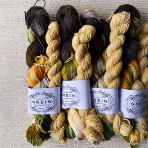 Inspired by floral folk art this sock set colourway is OOAK and will knit up into a pair of micro-striping socks. There is enough yardage in a sock set to easily make an adult pair of socks.