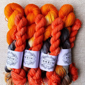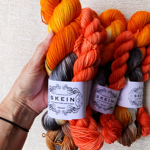 Our special edition sock kits are inspired by beautiful Halloween illustrations. Colours will knit up into a micro striping pair of adult socks. Each kit comes with a 20g mini skein dyed in a co-coordinating colour for fun heels and toes, stripes or colourwork. Colourways are one-of-a-kind and will never be repeated, so if you see a kit you love, grab it while you can.