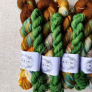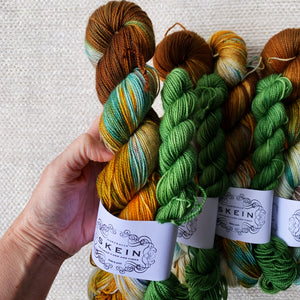 Inspired by floral folk art this sock set colourway is OOAK and will knit up into a pair of micro-striping socks. There is enough yardage in a sock set to easily make an adult pair of socks.