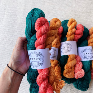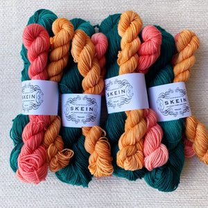 Colourwork Sock Sets contain a 100g skein with two contrasting 20g minis. They are perfect for colourwork socks, cowls, mitts and more!