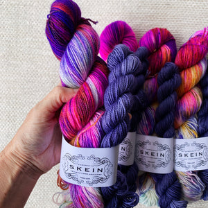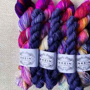 Inspired by floral folk art this sock set colourway is OOAK and will knit up into a pair of micro-striping socks. There is enough yardage in a sock set to easily make an adult pair of socks.