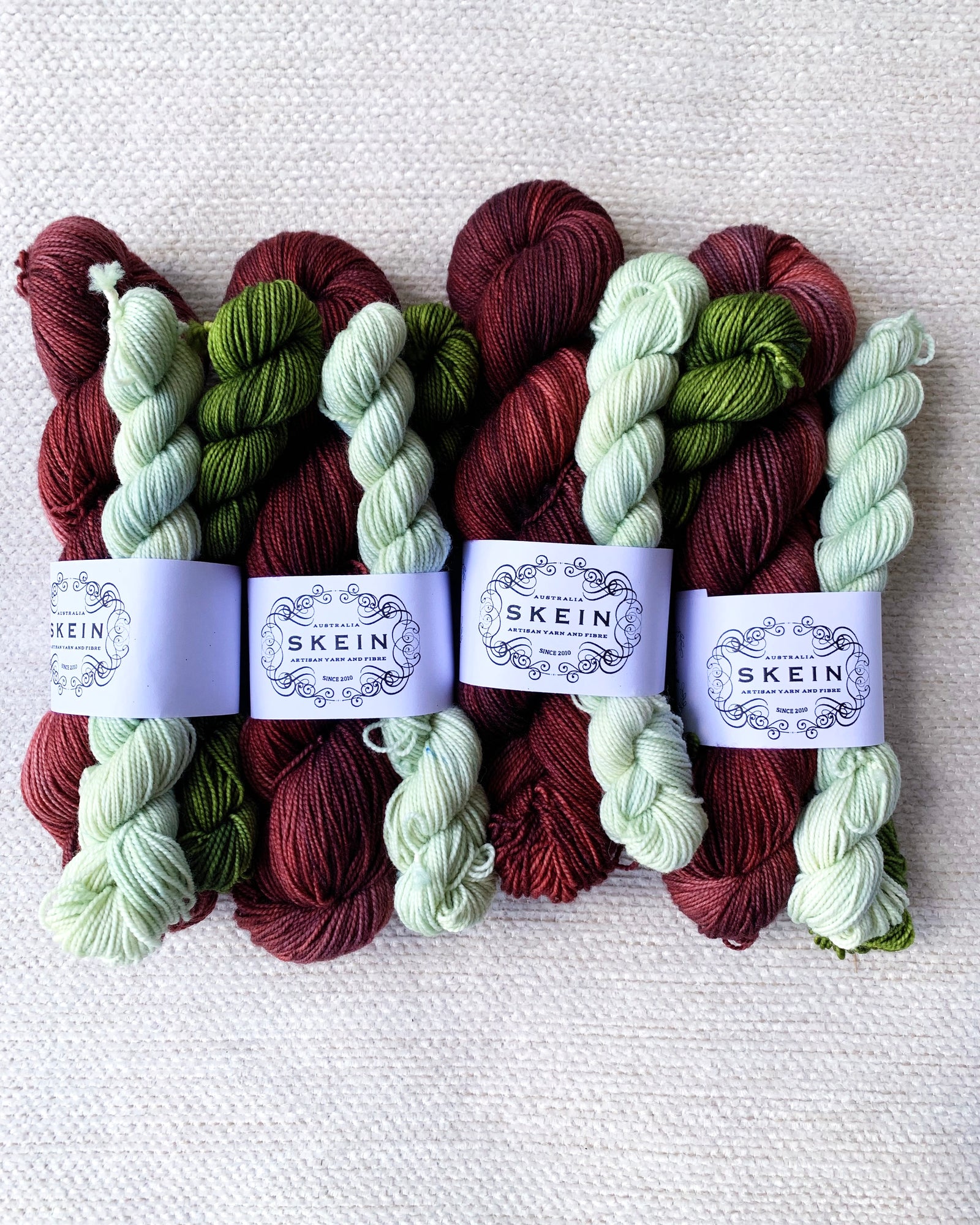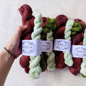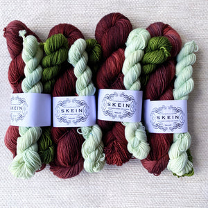 Colourwork Sock Sets contain a 100g skein with two contrasting 20g minis. They are perfect for colourwork socks, cowls, mitts and more!