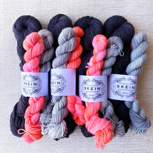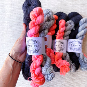Colourwork Sock Sets contain a 100g skein with two contrasting 20g minis. They are perfect for colourwork socks, cowls, mitts and more!