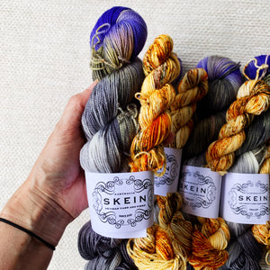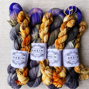 Our special edition sock kits are inspired by beautiful Halloween illustrations.  Colours will knit up into a micro striping pair of adult socks.  Each kit comes with a 20g mini skein dyed in a co-coordinating colour for fun heels and toes, stripes or colourwork.  Colourways are one-of-a-kind and will never be repeated, so if you see a kit you love, grab it while you can.