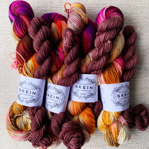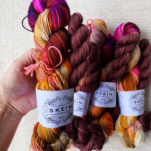 Crystal Collection sock sets have been dyed especially for our 15 year - i.e. crystal - anniversary.  Colours are inspired by crystals/gems and are one of a kind and will never be repeated. So, if you see a kit you love, grab it while you can.  Each sock set will knit up into micro stripes.  There is enough yardage in a sock set to make an adult pair of socks.