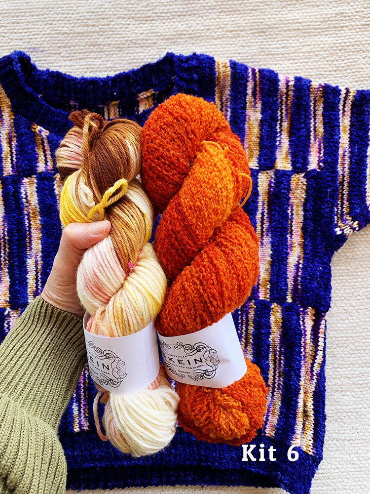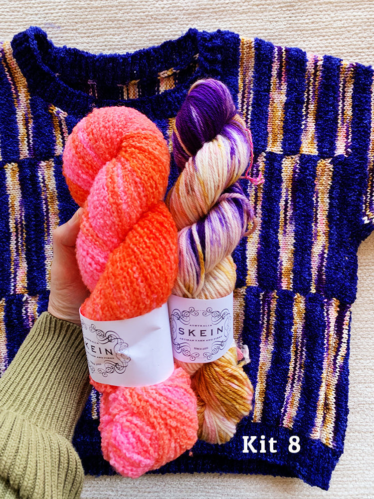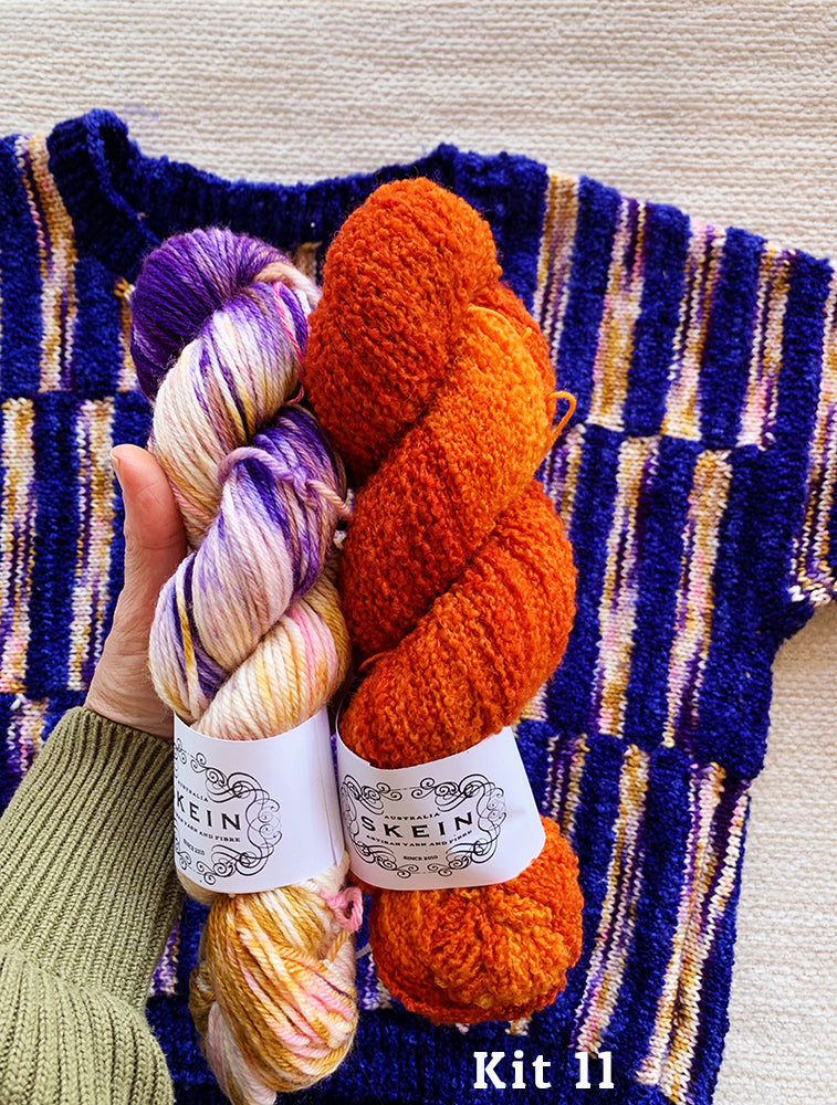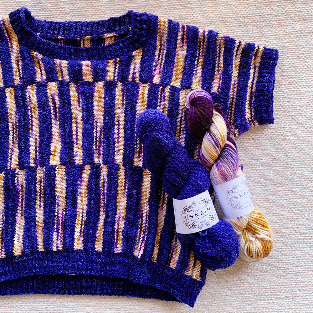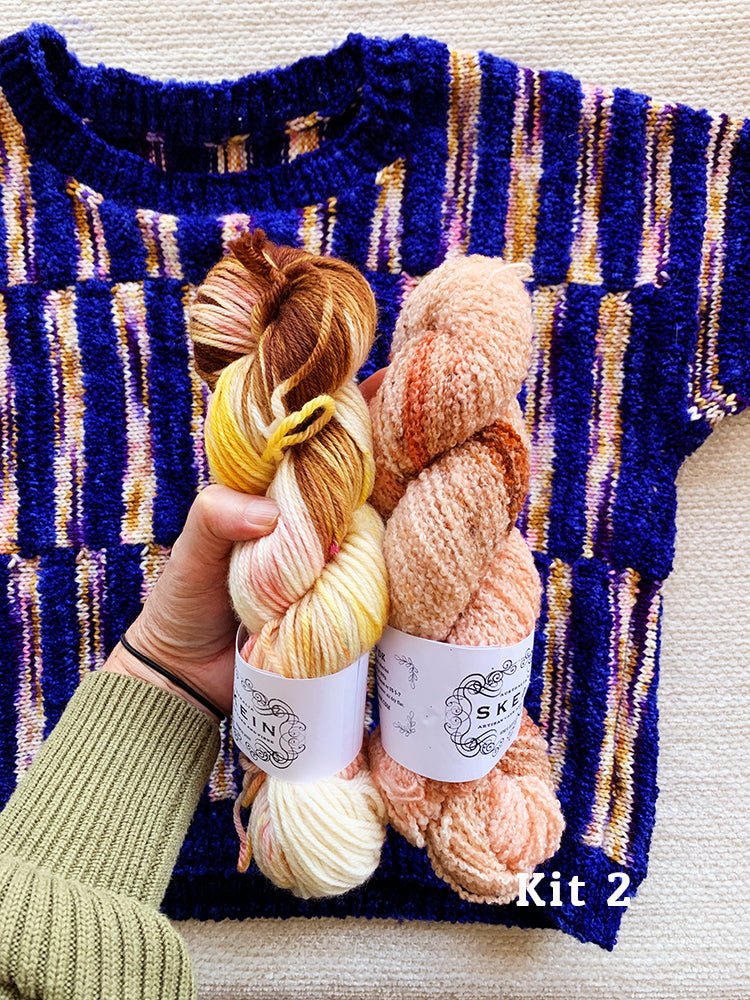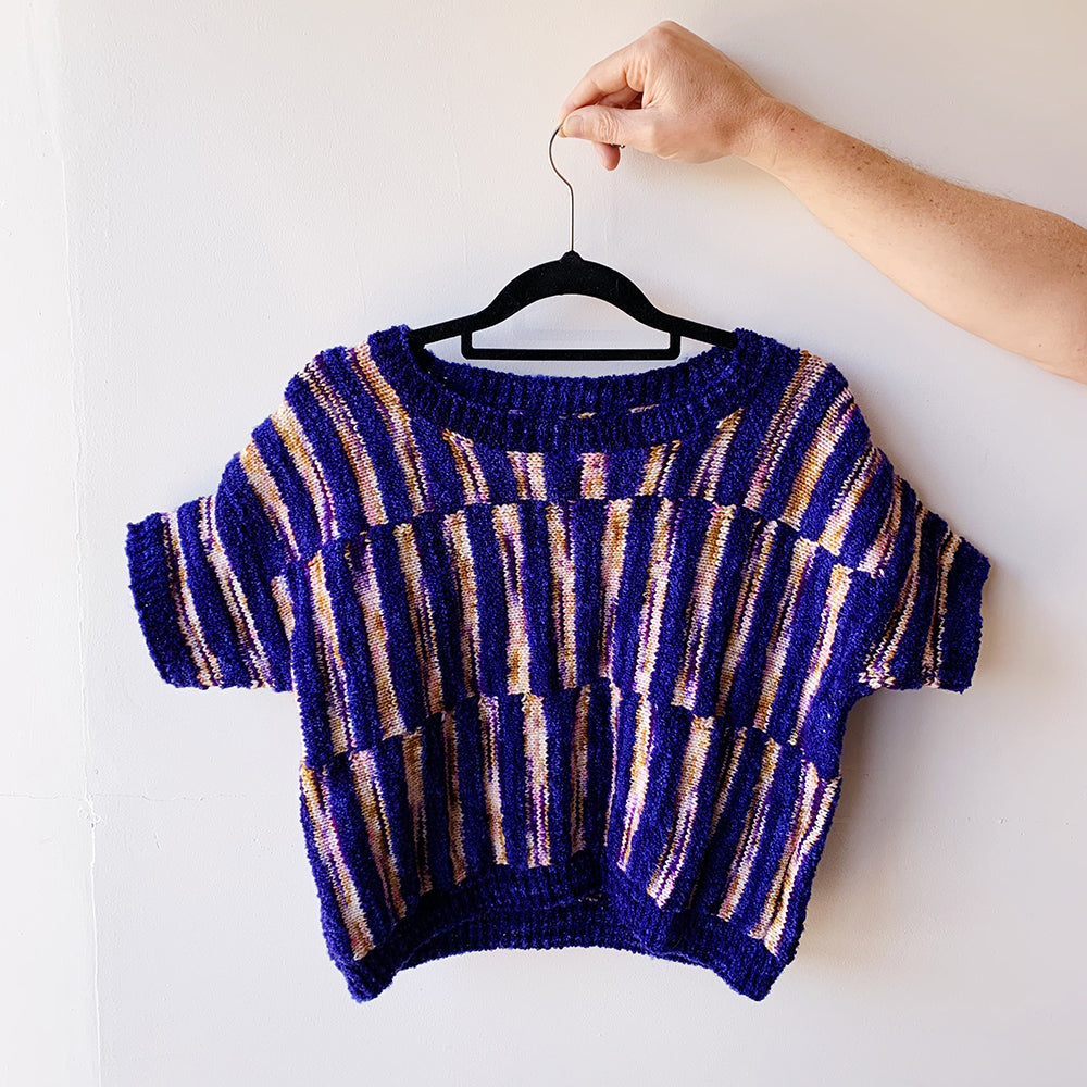 Super fun to knit and, just as fun to wear, is James N Watts' design: A Shirt of Fire and Ice.  The top is knit in modular stripes and features a unique construction that is very intuitive and easy to knit!  We played around with adding some texture to the stripes by using our bouclé yarn Curly with our regular Cushy DK.  The result is wonderful and we thought it would be perfect for our spring kit collection!  We used Kit 1.