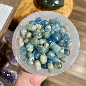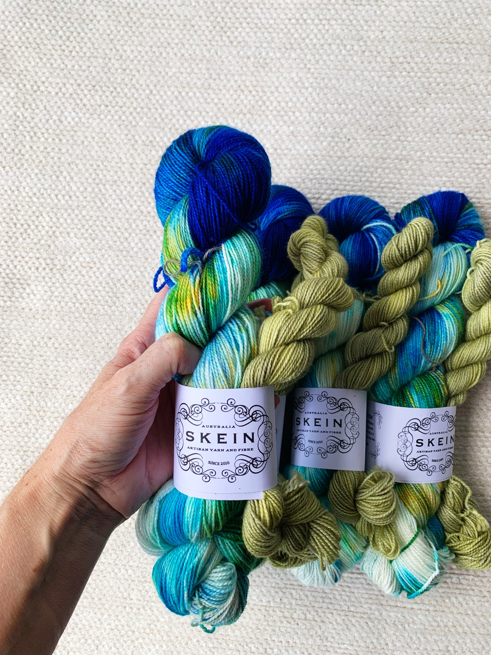 Splashes of sage, gold, blue and sapphire with a lichen green mini.