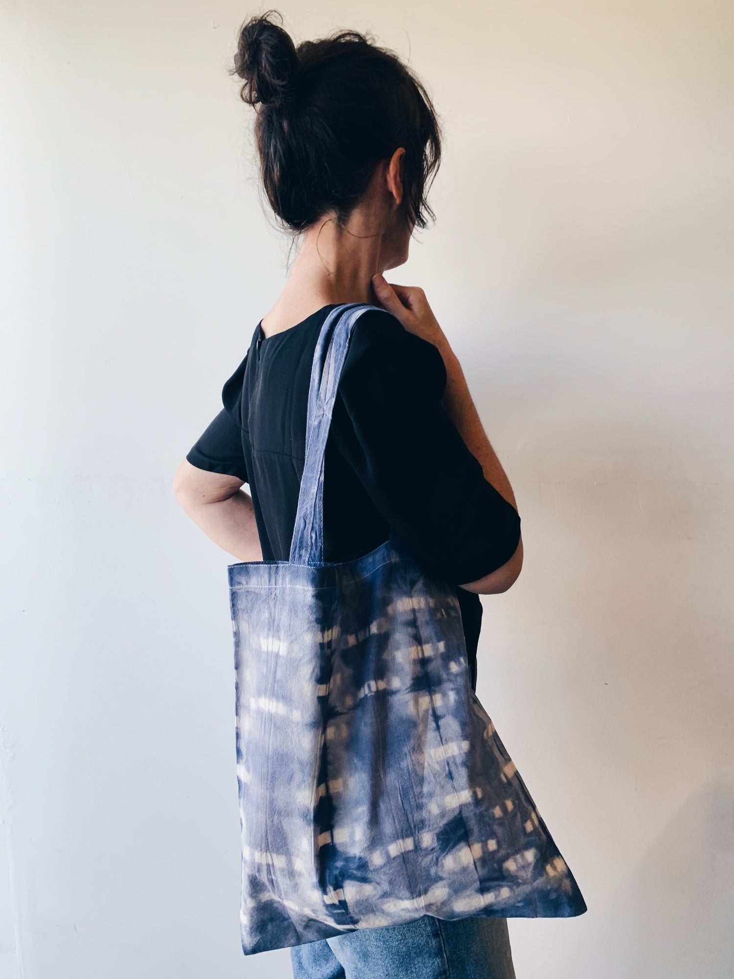This collection of bags has been dyed with a coastal colour palette in mind. Each bag is 100% cotton and features its own unique shibori pattern dyed in our studio by Kristen. They are the perfect size for most sweater projects or large shawls.