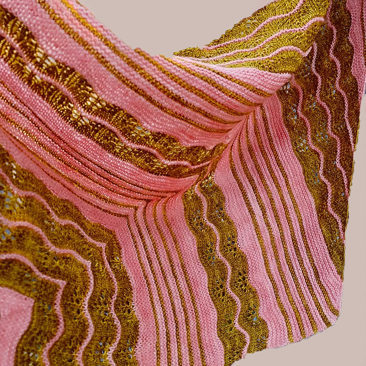 A beautiful wrap designed for slow, satisfying knitting, Gigglemug by Sara R. combines garter stitch stripes with delicate lace for a shawl that feels both cosy and pretty to wear.