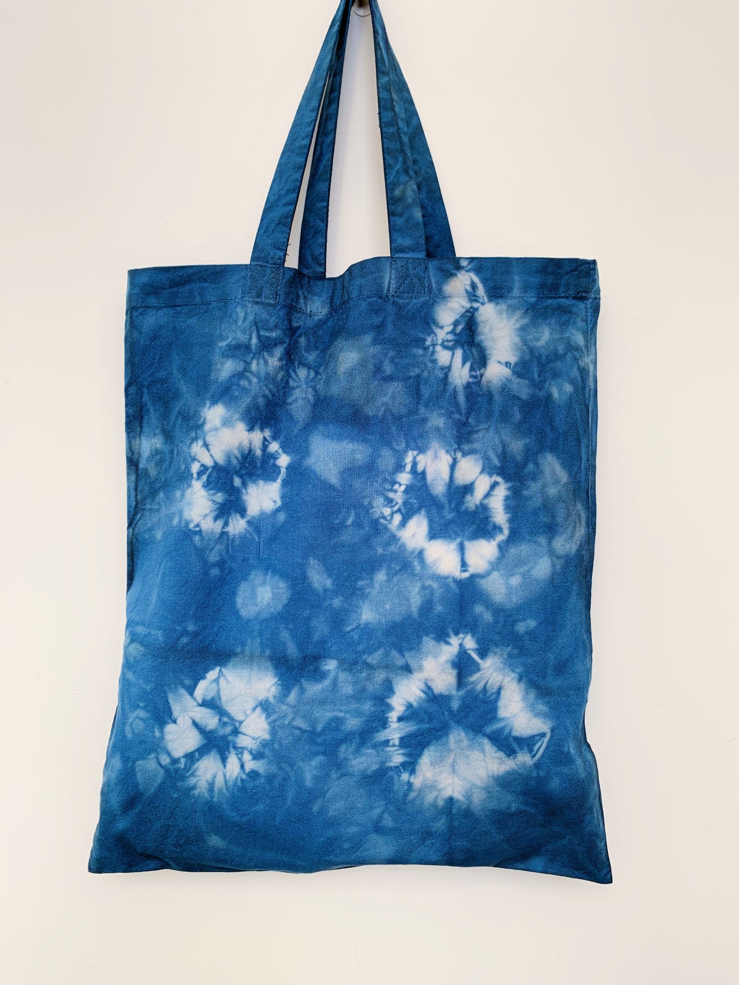 Each bag is 100% cotton and features its own unique shibori pattern, dyed in our studio by Kristen. They are the perfect size for most sweater projects or large shawls.