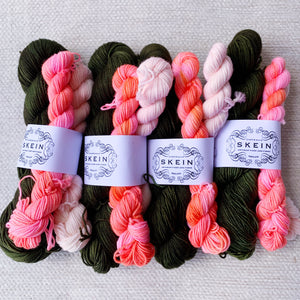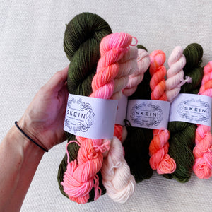 Colourwork Sock Sets contain a 100g skein with two contrasting 20g minis.  They are perfect for colourwork socks, cowls, mitts and more!